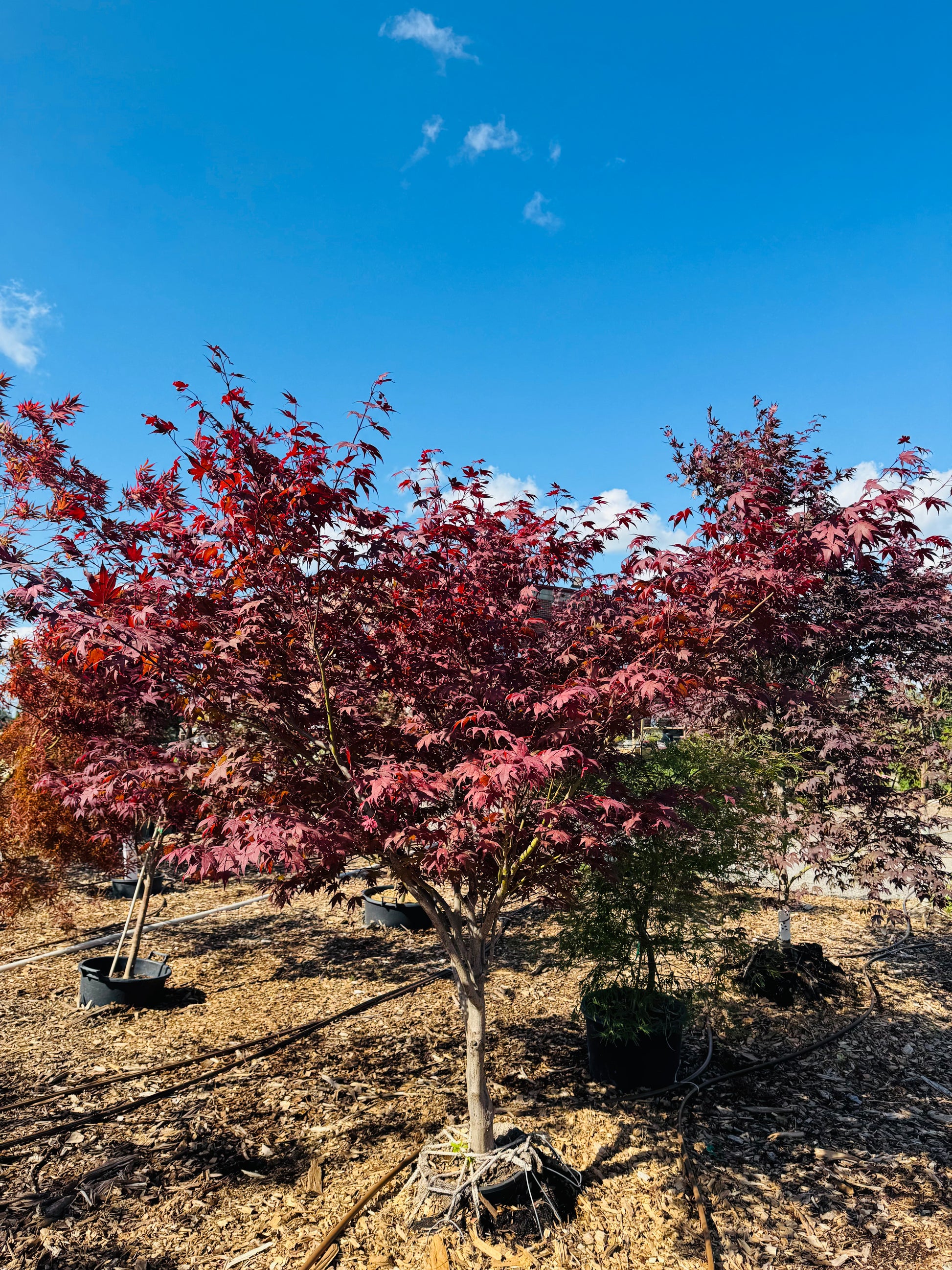 'Fireglow' leafs out as a bright red, before maturing to a deep maroon for the summer. 'Fireglow' will get an orange-red glow to the back side of the leaf when grown in the sun, giving the tree a brighter appearance and making it glow.